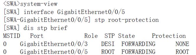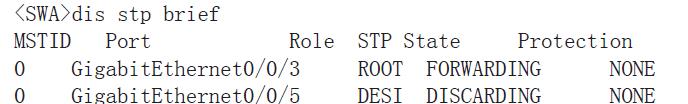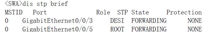 从日志信息上可以看到 SWA 连接 SWB 的端口 5 处于 discarding 的状态,而端口 3 变成 UP state 并处于forwarding 状态,为了进一步得到详细的信息,在终端窗口上输入display stp brief 命令,显示如下信息: