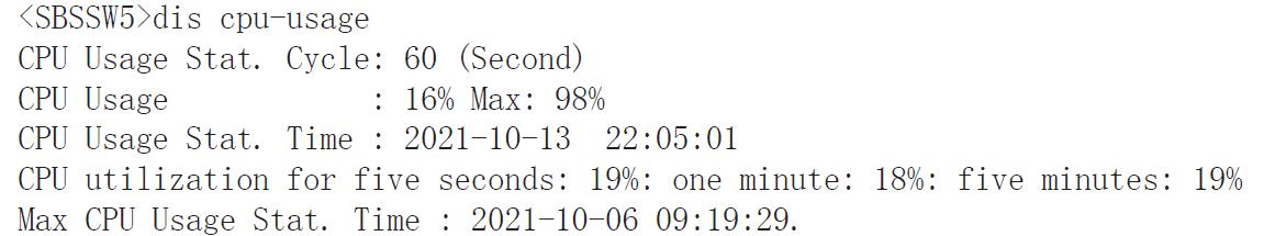 输入命令 display cpu-usage,发现 SW5 的 CPU 占用率最高达到了 98%。