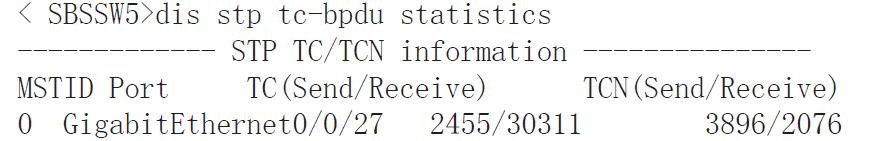 通过 display stp tc-bpdu statistics 命令查询 TC 报文,可以看到 SW5 的端口 27 收到了大量的 TC 报文,而且一直在增长,由此可以判断TC 报文不是SW5 产生的,而是来源于跟SW5 互联的SWA 设备端口2。