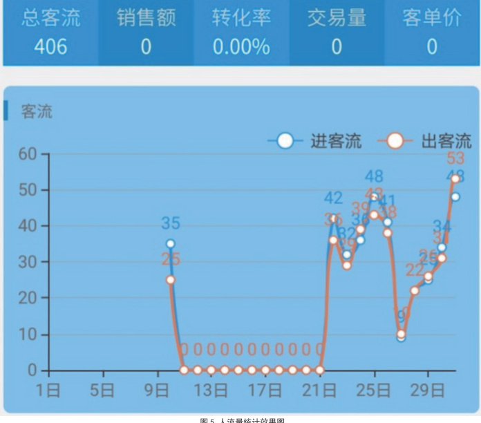 系统通过结合门禁和摄像头对区域中的人流进行统计,人流实时监控效果表现为对进出客流量的动态监测。通过图表,可以清晰看到进客流和出客流在不同日期的变化趋势。这里以园区中的药店为例,人流量统计效果图如图 5 所示。可以容易发现系统对客流量的波动有较好的捕捉能力。系统支持基于不同维度的统计分析,包括日报表、周报表、月报表、季报表、年报表以及自定义特殊日期统计。通过图形化数据展现和列表展现,用户能够全面了解人流量数据。同时,系统支持自定义搜索时间范围进行查询统计,用户可以根据实际需求选择特定时间段查看人流量情况,方便用户根据不同业务场景进行深入分析。