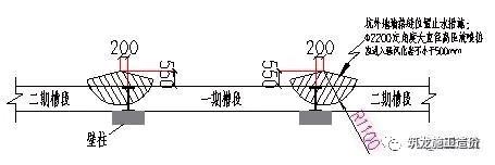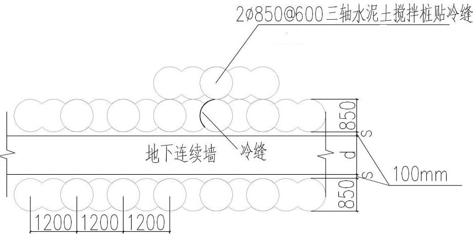 在施工过程中,必然会产生冷缝,专项施工方案内应充分考虑。施工前首先要将出现的冷缝位置在图纸上和现场标注出来,后续处理时,在产生冷缝位置的外侧,补打两根φ850@600的三轴搅拌桩,搅拌桩参数同槽壁加固设计参数。具体施工方法见图3.1-1。