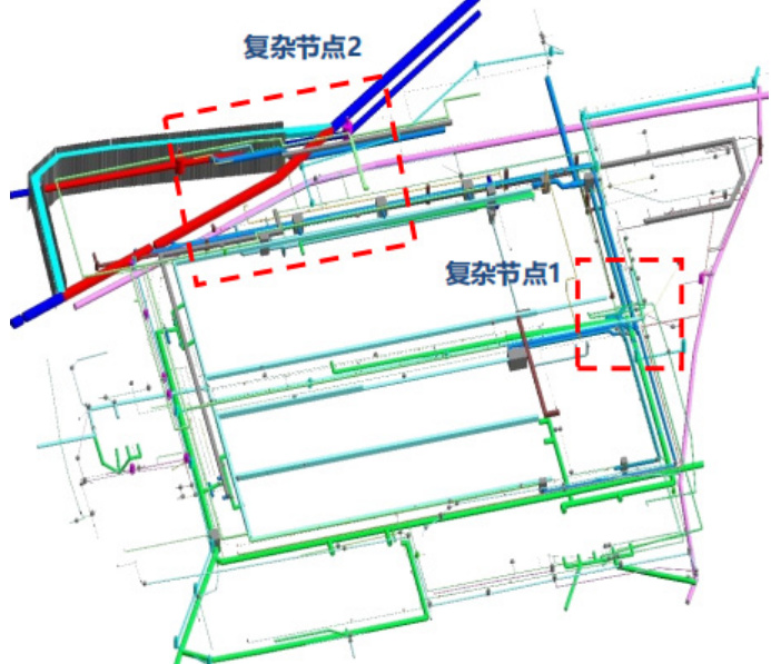 因为项目用地比较紧张,所以采用无人机倾斜摄影技术来采集现状建(构)筑物信息,进而创建三维实景模型当作设计数字底图,同时运用水面效果优化技术,对水面破洞平面开展约束和平整处理工作,让模型精度达到3 厘米级,以此满足标高、距离及面积测量的需求,基于现状管线竣工图纸和管线物探数据,使用自研现状管线创建工具进行现状管线三维建模,梳理并且复核现状地下管线信息,为总图管线设计提供有效指导,根据系统类型对管线进行配色,让其携带材质、标高、尺寸和节点属性等信息,准确获取现状管线的种类、布局、走向、管径及埋深等关键信息,为后续的管线设计和改造工作提供基础,依据厂区设计功能需求,对总图管线进行精细化设计,针对复杂节点区域开展优化设计工作,比如二期滤池及清水池区域、一期絮凝沉淀池区域等,对需要改造的单体进行详细设计,结合现状情况和设计要求,确保改造后的单体能够满足功能需求,按照设计标准和工艺要求,对新建单体进行精细设计,涵盖建筑、结构、工艺等多个专业。如下图1。