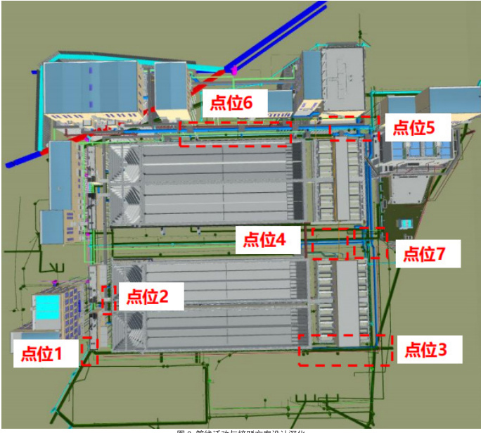 设计团队和 BIM 团队开展协同工作,利用内部漫游和三维剖切等功能,对各个单体实施全方位、多角度的校核工作,比如在炭滤叠合消毒池、调节水池、提升泵房及后臭氧池的校核当中,发现并解决工艺和建筑、结构方案存在的冲突,以及预留套管、洞口、设备基础等方面的问题,通过逐个单体内审并且确认优化方案,以此提高设计质量,减少施工过程当中的变更情况。基于 BIM 模型对总图管线进行综合以及优化,解决管线复杂区域存在的碰撞问题,整合总图以及各子项模型,反映一期、二期滤池等管线复杂区域的管道接驳点位,校核安装空间,提前发现可能存在的风险点,利用自研的管线检查及优化工具,按照设计要求的管道叠合顺序和间距要求,高效开展管线交叉方案的复核工作。该工具能够快速识别交叉点可能存在的管线冲突或净距不足等问题,提高复核工作的准确性和效率,在管线深化设计过程里,协调总图管线图纸出现的问题,记录总图管线标高与单体存在不一致、总图管线与井、现状管线等碰撞等问题,并及时对这些问题进行处理。通过对现状管线模型、总图管线模型、新建及改造单体模型、场地模型等进行整合,梳理总图管线建设的相关信息,确定新旧管道接驳的具体内容。