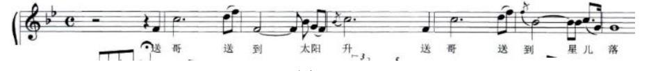 《情歌》A 乐段歌词“送哥”的重复以及“太阳升”“星儿落”的表述,描绘出女主娜仁高娃送别爱人时的场景,演唱时“送哥”二字要唱得深情,“太阳升”“星儿落”唱出一种悠远的感觉,营造出回忆的悲伤氛围。B 乐段乐曲旋律高亢明亮,4 个乐句环环相扣,将娜仁高娃与舍楞的爱情故事娓娓道来,如歌词“从你的胸膛轻轻流过”,需以轻柔、深情且略带眷恋的情感演唱,突出对爱人的温柔爱意与不舍。