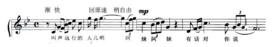 随后,两个乐句节奏逐渐加快,用三个三连音构成紧凑的乐句,也彰显出蒙古族音乐的地域特色。这种创作方法不仅更能表现人物情感,也将故事发展推向一个小高潮。两个“阿妹”连用,将女主人想留住男主的不舍与含蓄展现出来。