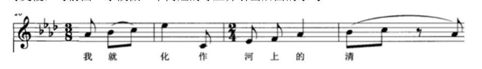 B 乐段第四乐句之后,旋律再次升高,紧凑又规整的节奏将故事继续谱写。整个乐句都采用“2+4+3”的组合形式,将歌词中的问答串联起来,歌曲节拍从 3/8 拍到 2/4 拍转变,乐曲速度变化、歌唱力度由弱变强使歌曲呈现独特的艺术性。