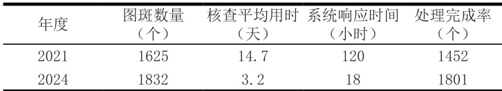 图斑数量略有上升但系统响应时间缩短,平均由原来的 5 天内响应降至不足一天,核查周期缩短了 4 倍以上,处理完成量更接近总数,显示出测绘技术在提升管理闭环效率方面的成效。
