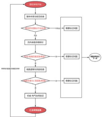 在传统机械制造领域,电气图纸的审核主要依赖人工操作,审核人员需要凭借自身专业知识和经验对图纸中的线路连接、元件参数标注、逻辑关系等内容进行逐一核对。一般流程(见下图1)是审核员先查看图纸的整体布局和设计规范是否符合行业标准,如GB/T4728《电气简图用图形符号》等相关国家标准;然后详细检查每一个元件的型号、规格是否与实际需求匹配,线路走向是否合理,有无短路、断路等潜在风险。例如他们在审核大型机床的电气图纸时要对照机床的机械结构仔细确认电机的接线方式、继电器的控制逻辑是否正确;很明显这种人工审核方式存在诸多局限性,审核效率极低,一张复杂的电气图纸往往需要耗费审核员数小时甚至数天的时间并且容易受到审核员个人状态、专业水平差异等因素影响,从而导致审核结果出现偏差[2]。