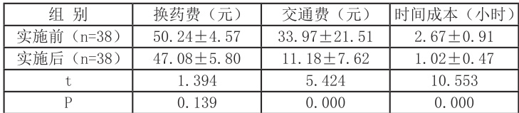 模式实施前后慢性伤口患者平均经济成本和时间成本的比较见表 1-1。其中,模式实施前后患者换药费用差异无统计学意义 (P>0.05) ),而交通费和时间成本差异均有统计学意义( (P/0.001) )。