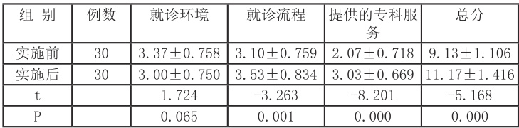模式实施前后慢性伤口患者的满意度比较见表 1-2. 通过对比,模式实施前后患者对就诊环境评分差异无统计学意义 (P>0.05) ),而对就诊流程评分、对提供的专科服务评分以及总分差异均有统计学意义( ⋅P⟨0.001⟩ )。