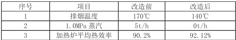改造后对水热媒空预器系统进行了标定,表 1 给出了改造前后相关运行数据,由表可以看出,改造后 1.0MPa 蒸汽消耗量由 5t/h 降至 0t/h ,加热炉排烟温度由 170∘C 降至 140∘C ,加热炉热效率由 90.2% 提高至 92.12% ,达预期的改造目的。