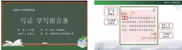 课前,备课组一起遴选国家中小学智慧教育平台上的相关课程资源,在课堂上播放首都师范大学附属小学史春义老师的讲解:实际生活中运用留言条的视频片段。本校教师引导学生讨论视频中的留言条使用场景与格式要点,检查孩子课堂练笔的效果,逐一快速批改。然后,相机补充更多生活中留言条的创意用法与注意事项,加深学生理解。