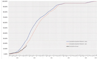 计划更新完毕后,利用P6 软件计算整体完成情况进而将完成数据更新到S 曲线文档中,生成实际完成曲线,与乐观/ 悲观计划曲线进行对照,反映项目实际完成情况,如图8 所示: