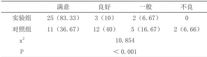 由下表 2 可知,实验组患者治疗后,患者满意度为 93.33% ,对照组患者治疗满意度仅为 76.67% ,明显低于实验组患者,数据差异具有统计学意义(P