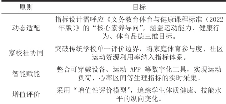 在体教融合政策框架下,评价指标体系的构建遵循动态适配、家校社协同、智能赋能、增值评价四大原则(表 1),设置基于核心素养导向的三级指标体系(表2)。