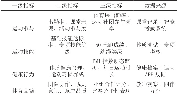 现有评价存在内容偏倚、方式滞后、主体单一的问题。将达标率视为首要目标,忽视学生个体差异 [1]。对运动参与态度、团队协作能力等隐性素养考核不足,重体能轻素养的评价导致学生“高分低能”现象普遍。采用期末集中考核的终结性评价,滞后的评价方式,缺少增值性评价 [2],结果管控弊端凸显。以体育教师为唯一评价主体[3],家长、社区、医疗机构等利益相关者参与度不足,多元协同机制缺失。