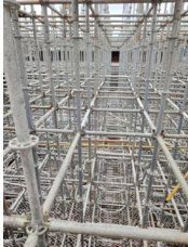 本项目梁、板模板支撑架体属于高大模板支撑,具有工程量多、架体高、承载大等特点。从安全角度考虑,高大模板支撑体系必须具备良好安全稳定性,要确保支撑架体的稳固性以防止发生垮塌等安全事故;从施工成本考虑,高大模板支撑体系应具备安装方便快捷和经济高效等优点。搭设效果如下图所示