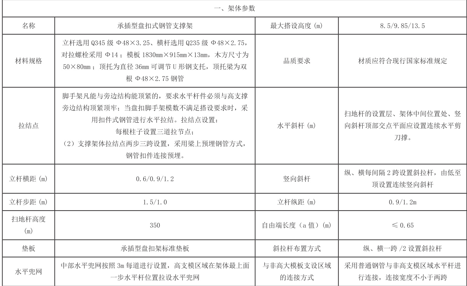 地基处理达标后,随即启动盘扣式支架的搭建流程。在此过程中,所有施工人员必须严格遵守既定的施工方案,确保每一道工序均达到相关规范与标准的要求。首要步骤为根据设计图纸所指定的间距,将立杆精确布置于地基之上,同时严格控制立杆的垂直度在允许的误差阈值范围内,以保障支架结构的整体稳固性。随后,进行横杆与斜杆的安装作业,此环节至关重要。所有杆件的连接必须达到牢固可靠的标准,确保盘扣连接的紧固程度满足设计要求。此外,针对可调底座与可调顶托的调整工作,需依据实际施工需求进行精确调校,确保支架的高度与水平度均符合设计要求。在支架搭设的过程中,必须设置安全警戒区域,并安排人员现场值守。同时,还需建立定期检查与维护机制,对已完成搭建的支架进行全面检查与保养, 确保其在施工期间的安全性与稳定性。最终,当支架搭建工作完成后,施工团队需对支架进行全面、细致的检查与评估。 评估内容包括立杆、 横杆、斜杆的连接状况,以及支架的整体稳固性与承载能力。唯有在确认支架搭建完全符合设计与规范要求后,方可进入后续的模板安装阶段。架体搭设参数如表所示。