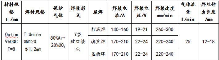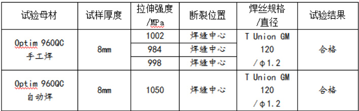 通过焊接试验表明,Optim 960QC 8mm 厚度高强度钢焊接性良好,焊后均无冷、热裂纹产生,试板焊接接头强度满足与母材等强匹配要求。