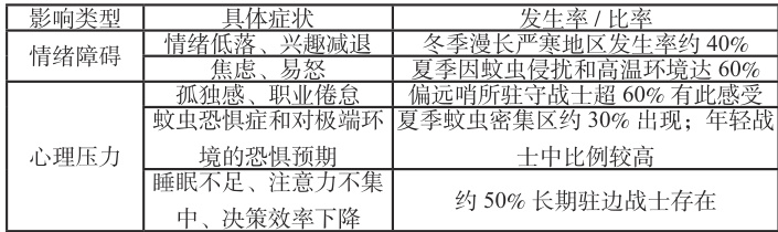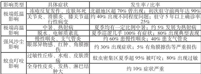调查显示,新疆地区长期驻边战士因为恶劣气候面临如下问题(表 1,表 2 所示)