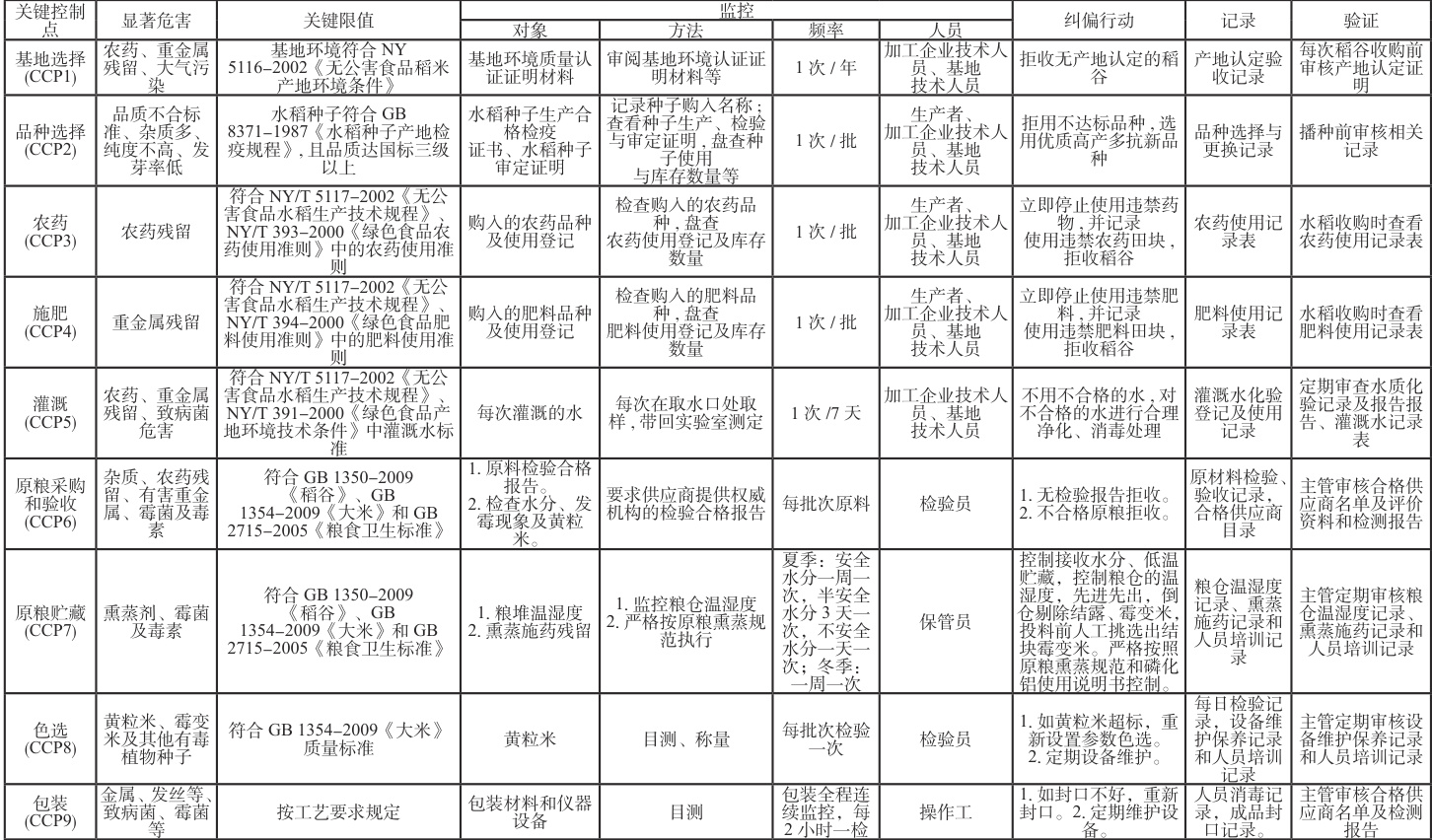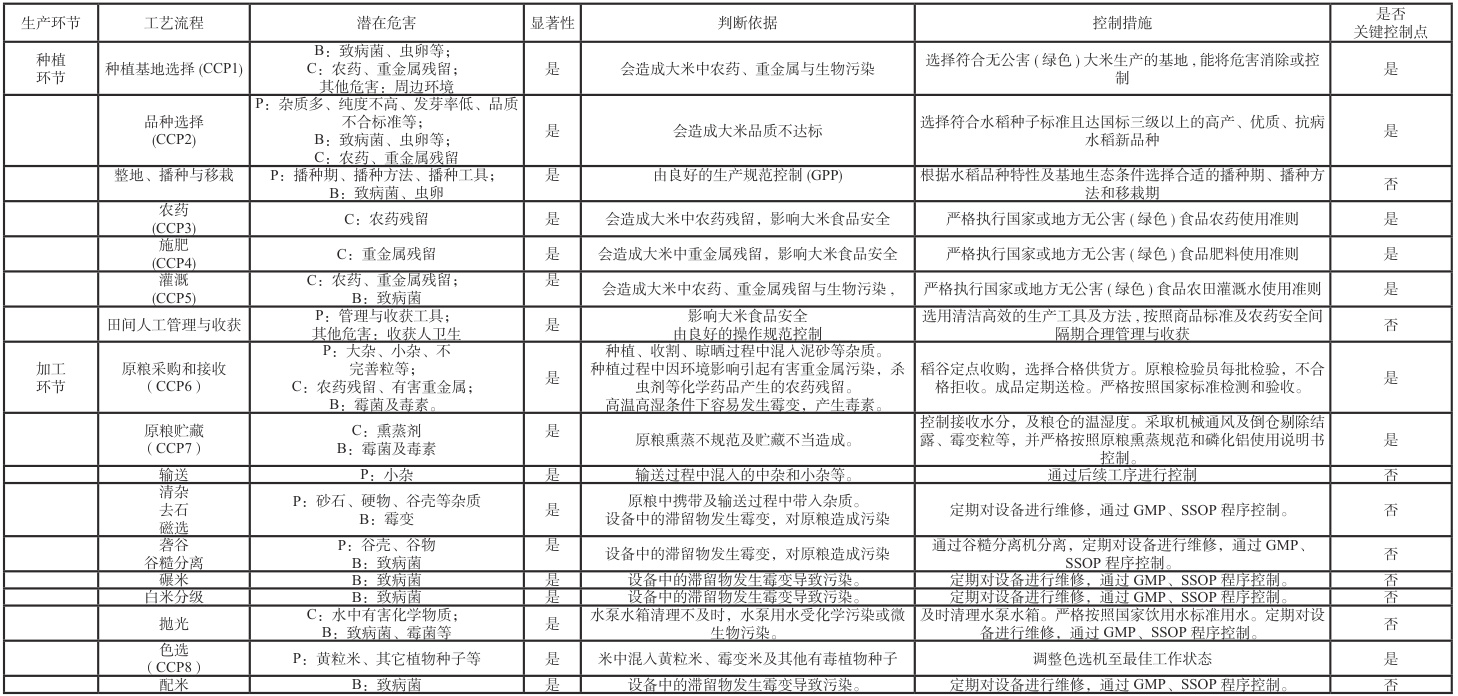 HACCP 体系建立程序主要包括危害分析、关键控制点确定、建立关键控制点的关键限制、关键控制点监控、关键控制点偏离时采取纠偏措施、监控记录和文件保存、建立验证程序等内容 [7]。将 HACCP 应用于兴安盟大米种植、加工与流通环节 , 根据潜在风险因素 , 确立关键控制点, 采取积极主动干预措施。