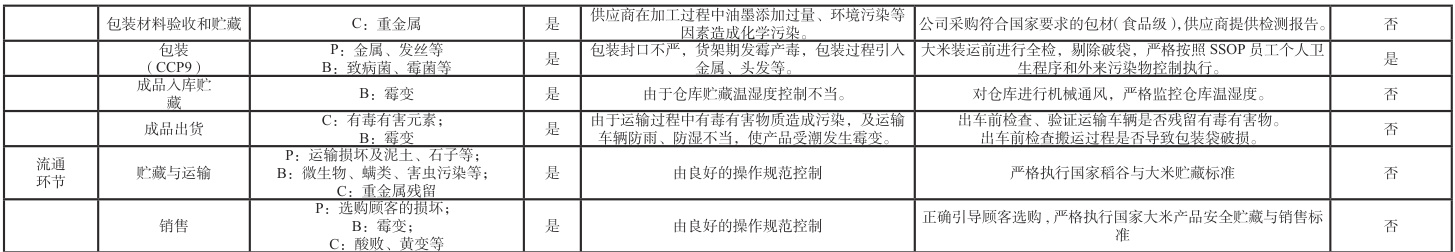 表2 兴安盟大米种、产、销全过程 HACCP 计划表