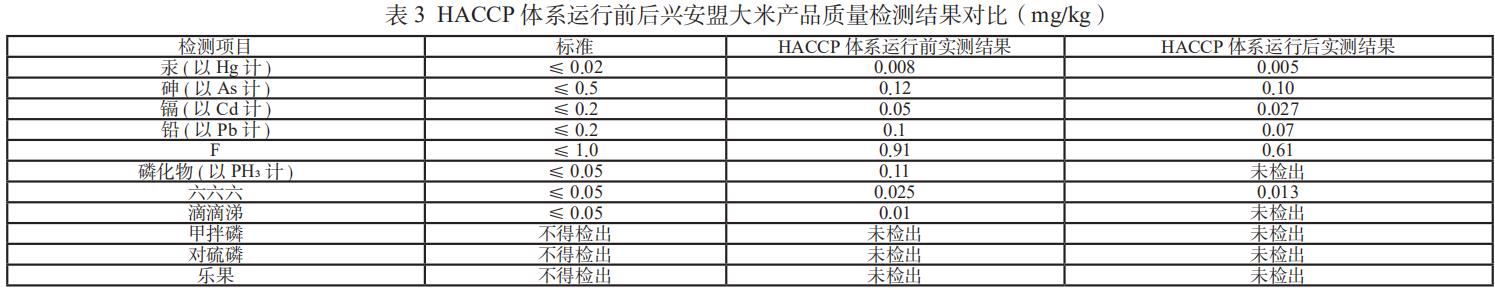 HACCP 体系计划表建立后,课题连续一年对兴安盟内某试验种植基地和加工企业大米产品质量标准及其生产流程图的准确性进行了多次的审核认证,对流程工序中的关键控制点进行了全程观察与检验。观察及检测表明,所有环节能够严格执行卫生操作要求,所有操作均有记录,未发现有偏离现象,经过一年的体系运行实践,该品牌兴安盟大米产品各指标的检测结果与 HACCP 体系运行前进行对比,所有的重金属和农残污染指标均有不同程度下降,如表 3,说明 HACCP 体系在兴安盟大米种植、加工和流通环节的应用能有效控制兴安盟大米的食品安全风险,同时对提高产品品质具有重要作用。