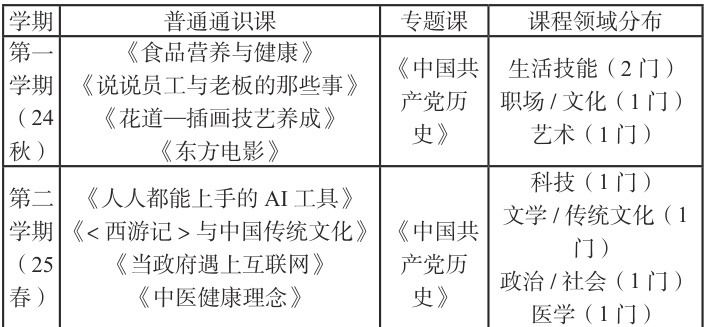 西财天府学院德阳校区 2024 年秋季学期与 2025 年春季学期均分别开设 5 门尔雅通识课程,包括 4 门普通课程与 1 门专题课程(详见表 1)。关于选课,首先发布尔雅通识课选课公告,其次通过电话、面对面、辅导员等途径答疑;最后在工作群中向辅导员转发选课相关须知。