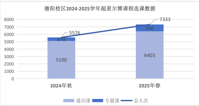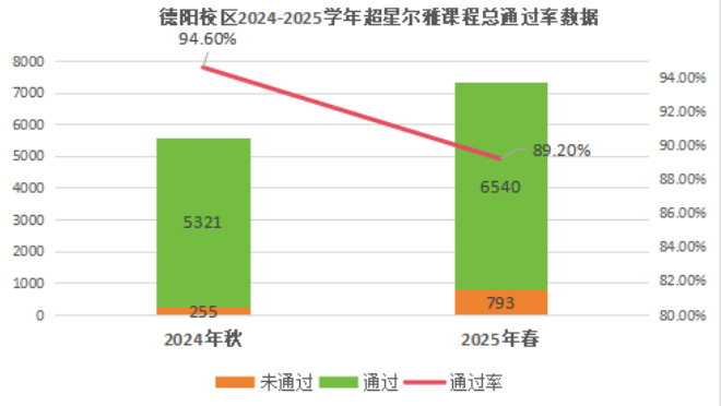 如图表所示,首先,第二学期比第一学期选课总人数增加 1757 人次,但此数据变化的主要原因在于大一学生从第二学期才开始进行尔雅课程的选课学习,选课总人数也就不在我们的数据分析中。其次,整体而言,第二学期课程线上通过率从 94.6% 降至89.2% ,降幅为 5.4% ,普通通识课线上通过率更是从 95.2% 降至 88.1% ,降幅显著 (7.1%) ,通过分析我们考虑课程难度、学生参与度、教学管理强度是导致该结果的三个重要因素。