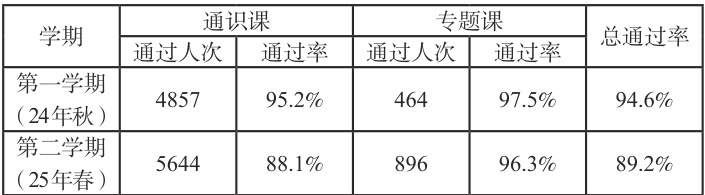 首先是课程难度与学生参与度,如表1 所示,第一学期的普通通识课主题偏向生活、艺术、文化等方面,内容更加通俗,学生选课与学习的积极性都会更高,同时有生活实践的基础,通过率也更高。第二学期的普通通识课涉及领域更加专业和抽象,主题多为科技、政治、医学,学习难度更大,如《人人都能上手的AI 工具》《当政府遇上互联网》这类课程,学生很可能会因基础不足而学习困难甚至中途放弃。此外,《中国共产党历史》在两个学期均保持高通过率( 96% 以上),表现稳定,说明课程内容、考核模式的统一且成熟(如固定题库、以客观题为主)等标准化教学更利于把控教学效果与质量,对课程完成度有积极作用。