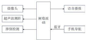 本系统采用树莓派 4B 作为核心控制器,构建了一套集环境感知导航提示与安全监护功能于一体的智能导盲眼镜。系统通过摄像头模块实时采集环境图像数据,并利用 OpenCV 库进行图像处理与分析,精准识别盲道特征,实时判断盲道相对于佩戴者的方位,并通过语音提供方位提示。同时系统配备超声波测距模块,持续监测前方障碍物距离,并在达到预设安全阈值时触发语音告警。为保障使用者安全,系统集成基于加速度传感器的跌倒检测模块,实时监测佩戴者姿态变化;当检测到加速度值超过预设跌倒判定阈值时,系统自动触发紧急求救语音播报。此外,系统内置蓝牙模块,可与用户手机连接,实现与手机导航应用进行交互,获取定位与路径规划服务。智能导盲眼镜的系统框图如图1 所示。