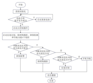 系统初始化后会判断是否进行蓝牙连接,如果没有连接成功会尝试重新去连接,连接成功后启动主控制循环,启动4 个线程的消息队列,判断消息队列的优先级来判断需要执行的功能,优先级依次是摔倒时进行语音播报,即将撞到障碍物时的语音播报,对盲道方位进行导航和障碍物距离播报,手机导航的语音播报。如图4 所示为系统整体流程图。