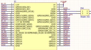 树莓派 4B 搭载的 Broadcom BCM2711 主控芯片通过其 40 针 GPIO接口为智能导盲系统提供了强大的扩展能力 [4]。这组多功能引脚阵列包含 28 个可编程 GPIO、2 个 UART 串口、2 个 SPI 总线、2 个 I2C 总线以及4 路PWM 输出等丰富接口资源,支持3.3V TTL 电平标准。此外,引脚阵列还包含 5V/3.3V 电源输出(最大 1.2A)、8 个接地引脚以及CSI/DSI 专用接口,为连接超声波传感器、惯性测量单元、摄像头等外设提供了完整的硬件支持。如图2 为主控模块电路设计。
