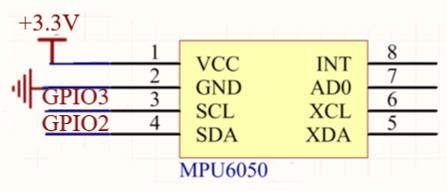 在本系统中摔倒检测使用 MPU6050 芯片,采用 I2C 协议将主控与该芯片连接。SCL 接到 GPIO3 作为 I2C 协议的时钟引脚, SDA 接到 GPIO2 作为 I2C 协议的数据传输引脚,SCL 上升沿时,MPU6050锁存 SDA 数据。起始时,SCL 高电平时,SDA 从高到低跳变,当进行数据传输 SCL 低电平时树莓派放置在高位先行的数据位,SCL 高电平时 MPU6050 进行采样,SCL 高电平时,SDA 从低到高跳变停止,MPU6050 的电路图如图 3 所示。