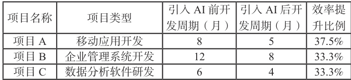 为直观展现人工智能在软件开发自动化中对效率的提升,对多个引入AI 技术的软件开发项目进行数据收集与分析,得到如下表格:
