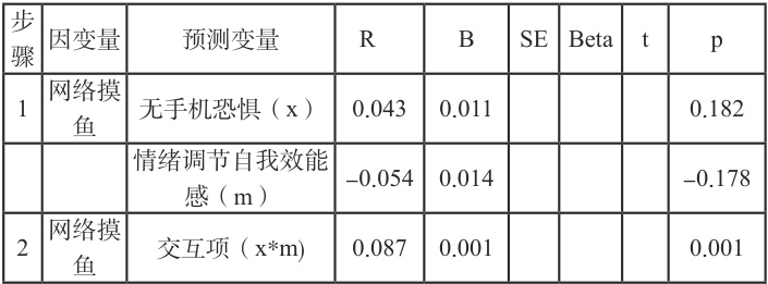 为检验情绪调节自我效能感在大学生课堂网络摸鱼和无手机恐惧中的调节效应,先将情绪调节自我效能感、无手机恐惧和网络摸鱼各变量中心化(数值减去平均值),将情绪调节自我效能感(调节变量)和无手机恐惧(自变量)进行相乘运算得出新的交互变量,然后进行分层回归分析。第一步以网络摸鱼(y)为因变量,无手机恐惧(x)、情绪调节自我效能感(m)为自变量进行回归;第二步以中心化后的自变量和调节变量形成的交互项为自变量( x*m )。经检验得出情绪调节自我效能感对无手机恐惧和网络摸鱼的关系具有显著的反向调节效应(p<0.05 )如表2: