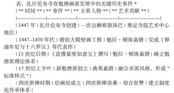 1、扎什伦布寺与勉唐画派的奠基:介绍扎什伦布寺作为勉唐画派发源地的历史过程,分析勉拉·顿珠嘉措的艺术创新和理论贡献,使用表格展示关键历史事件。