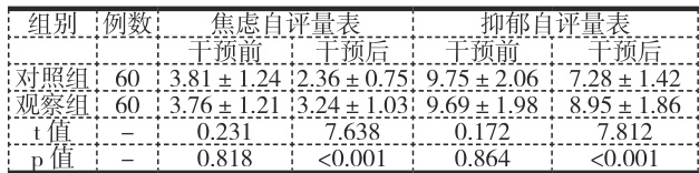 两组患者心理状况比较 观察组干预后焦虑自评量表和抑郁自评量表评分均低于对照组,差异有统计学意义 (P<0.05) 。见表 1