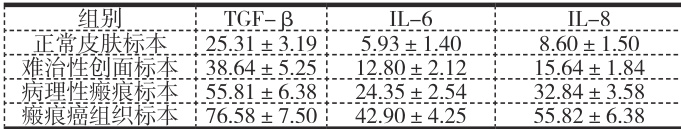 在 TGF- β 、 IL-6 和 IL-8 表达水平方面,正常皮肤标本、难治性创面标本、病理性瘢痕标本、瘢痕癌组织标本呈现出逐步升高趋势,差异存在统计学意义( P<0.05 ),见表 1。