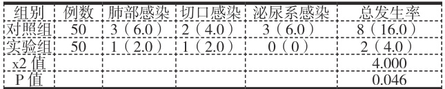 (2)并发症发生情况: 观察两组患者住院期间肺部感染、切口感染、泌尿系感染等并发症的发生情况。