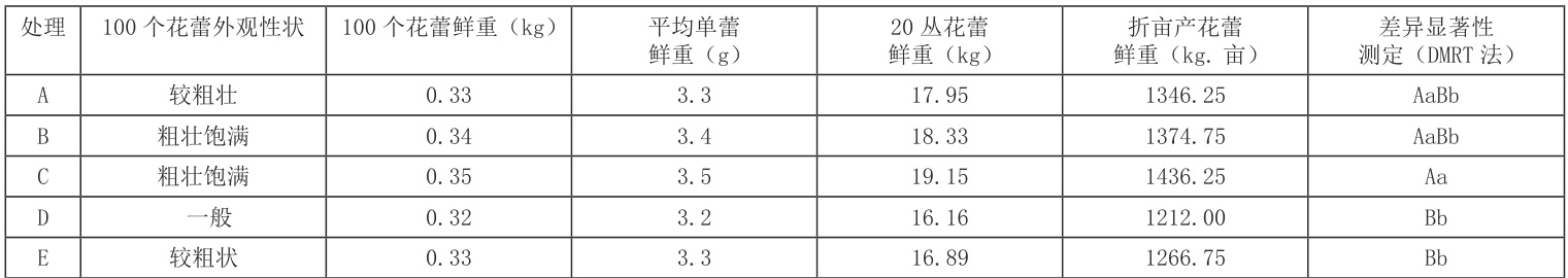 3.1 不同密度栽培对黄花菜产 , 根据相关资料,单花鲜重、花蕾数量是决定黄花菜花蕾产量的主要性状 鲜蕾最高,其次为T1 处理、T3 处理最差,即在较好肥力 表现对黄花菜产品最好,不仅花蕾粗壮,同时产量最高;