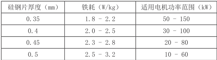 表格 1 :不同硅钢片厚度对应的铁耗范围及适用电机功率