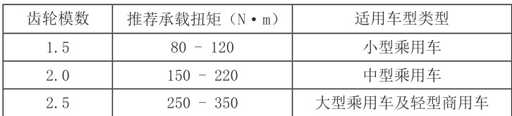 表格 2 :不同齿轮模数对应的推荐承载扭矩范围及适用车型