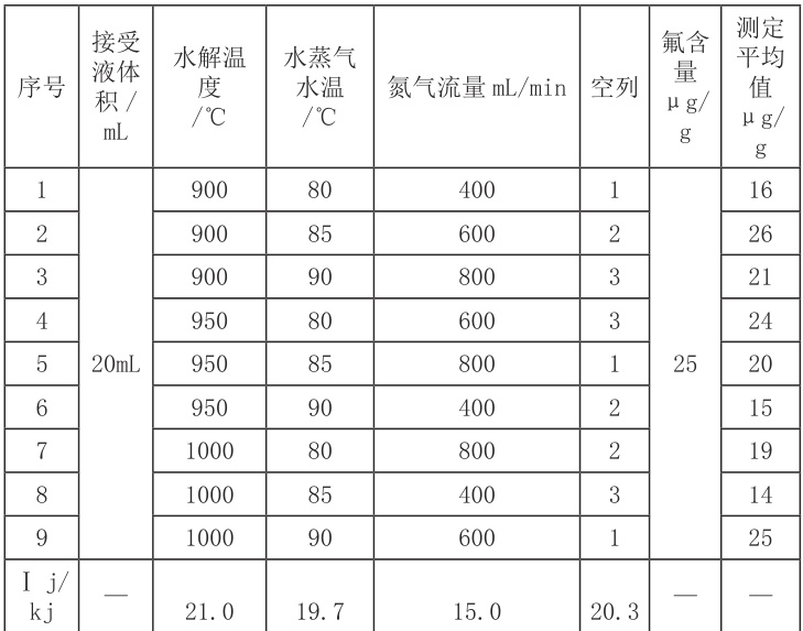 正交实验主要考察了水蒸气水温、水解温度和氮气流量对样品检测结果的影响,实验样品量为 1g,称取已知元素含量的样品,对同一样品进行测定,按照实验步骤进行操作。按照表 7 进行正交实验,每组条件下重复测定 6 次取平均值,并对实验结果进行了极差分析和方差分析,以氟离子数据分析为例,结果见表1。