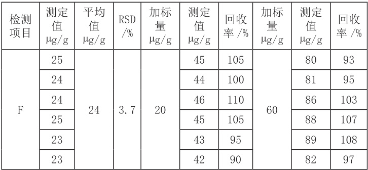 根据上述最优参数方法对氧化铝样品进行处理,分别称取同一样品 6 份,分为三组,一组作为本底,另外两组加入氟元素 4 倍下限和 12 倍下限的量,进行精密度和回收率实验,结果见表2。
