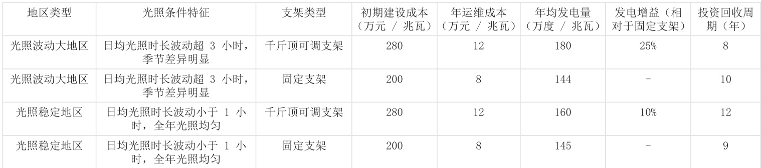 由表中数据可知,在光照波动大地区,千斤顶可调支架虽然初期建设成本比固定支架高 80 万元 / 兆瓦,年运维成本高 4 万元 / 兆瓦,但凭借 25%的发电增益,其年均发电量达到 180 万度 / 兆瓦,高于固定支架的 144 万度 / 兆瓦,投资回收周期为 8 年,短于固定支架的 10 年。而在光照稳定地区,千斤顶可调支架虽有 10% 的发电增益,但其高成本劣势凸显,投资回收周期为 12 年,长于固定支架的 9 年。