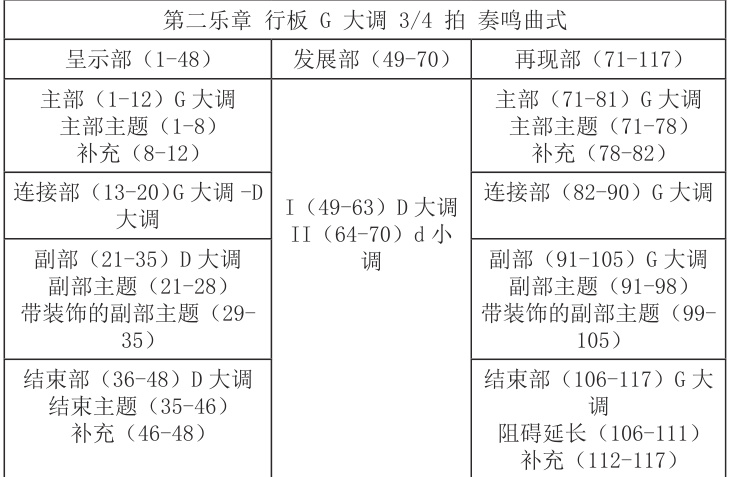 该乐章为行板,3/4 拍,G 大调,奏鸣曲式(表 1),呈示部(1-48 小节)与发展部(49-70 小节)、再现部(71-117 小节)结构清晰。值得注意的是: