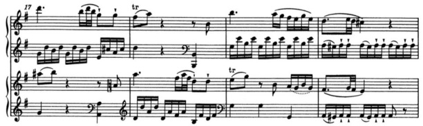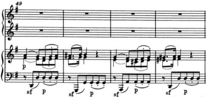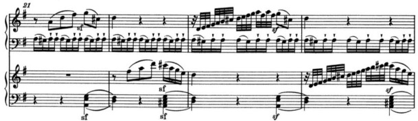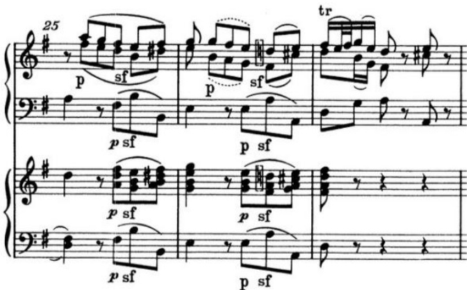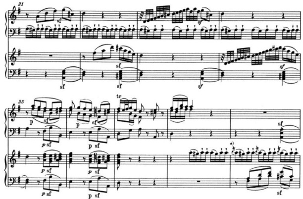 演奏者们对 sf( 突强 ) 的合理表达可以使两个声部所奏出的音乐语调与表情准确且丰富。如呈示部副部中标注的“sf”(突强,第 21-26、29-34 小节,谱例 3),要在“p”(弱)力度层里做适度的强调——音乐语气上的强调,而非物理重音。该段落中的“sf”(突强)均为强调和声的功能与表现。