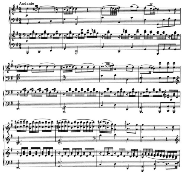 1. 调性安排:莫扎特在慢板乐章中常使用下属调性(本首 D 大调奏鸣曲,二乐章调性为 G 大调),赋予音乐柔和色调。