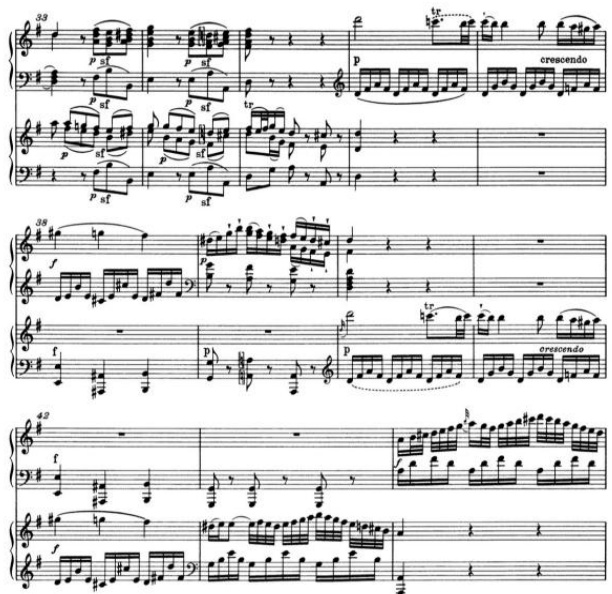 1. 呈示部。主部中,除第 37、41 小节标注“crescendo”(渐强)与 38、42-48 小节“f”(强)外,均为“p”(弱)力度。在连接部与副部,“p”(弱)力度下,标注有加重语调,用于强调语气重心与戏剧性,位于小节中第 3 拍的“sf”(突强),增强了音乐的张力与戏剧性。结束部则通过第 37 与第 41 小节两次标注在不同声部的“crescendo”(渐强)使呈示部音乐走向明亮光彩地终结。
